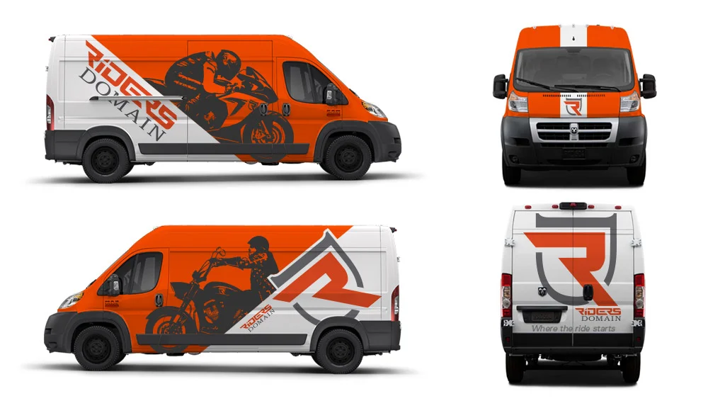 The online motorcycle retailer needed their company vehicle to stand out in a crowd. Using the companies bold colors with big logos and clean design, the van is easy to recognize. The simple motorcycle figures on each side affirm the companies involvement with the motorcycle industry.