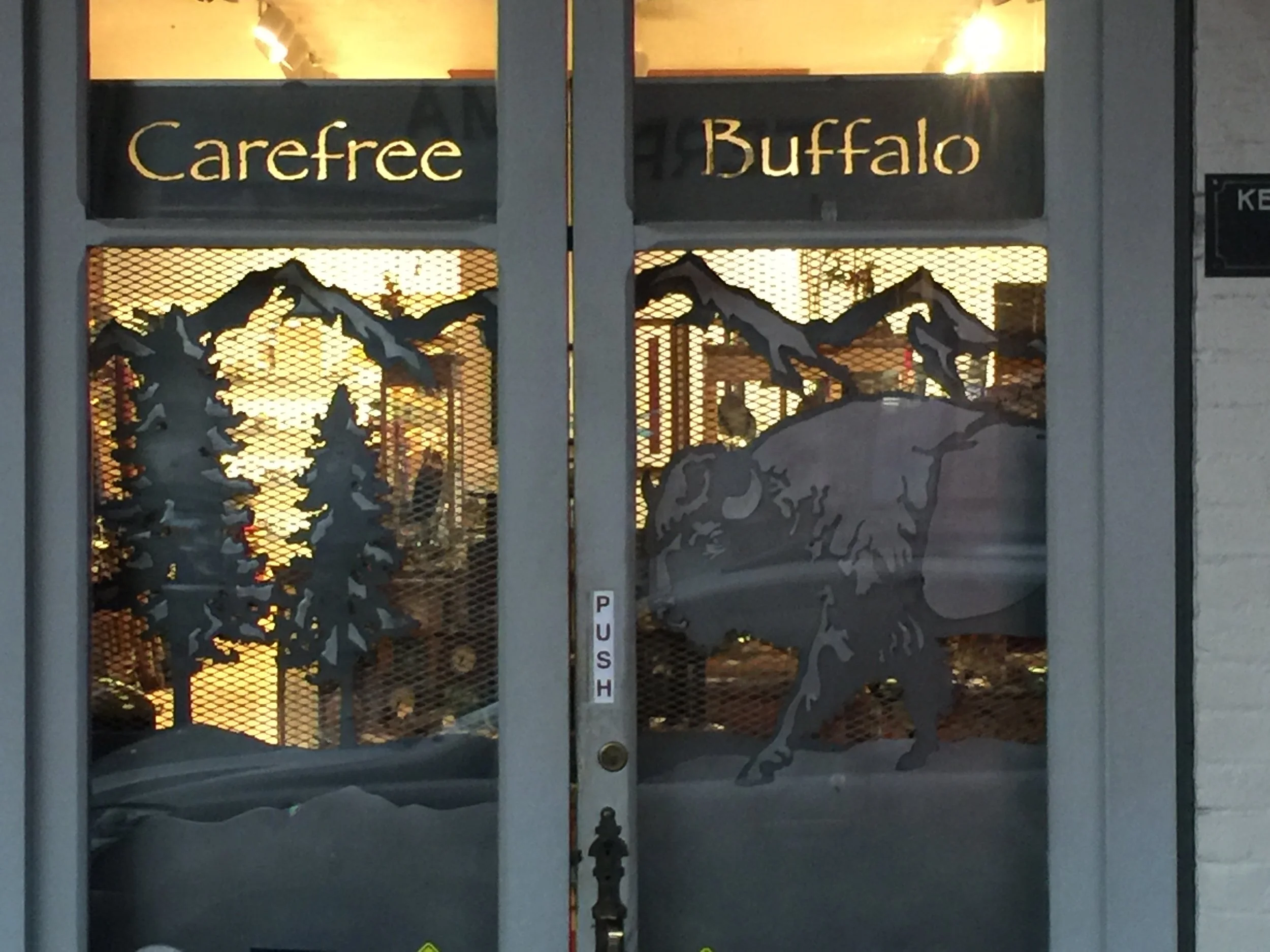 Carefree Buffalo requested a steel security gate for their store entrance. The multi layered steel gate incorporates plasma cut logos, buffalos, mountains and trees.