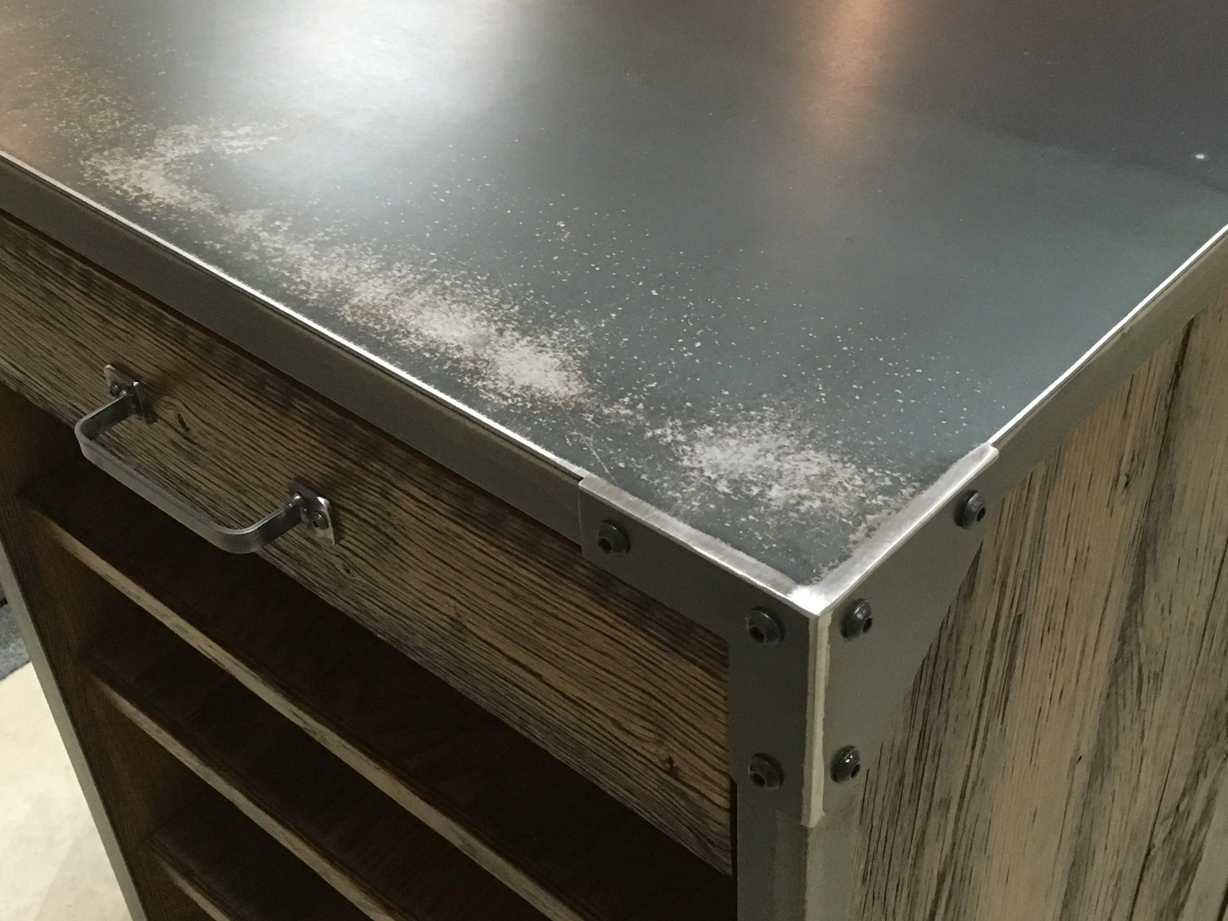 Reclaimed oak barnwood and raw steel create a unique yet very functional cabinet for Carefree Buffalo’s cash register. The top drawer and adjustable shelving provide ample storage for point of sale supplies.